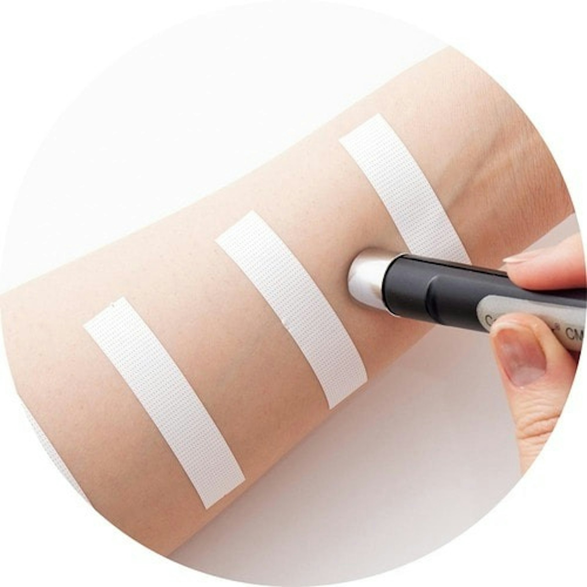 測試員將面膜剪成同樣大小,敷在多位受測者的手臂上。依照廠商建議時間敷用,並使用專業儀器測量「使用前」與「撕下後經過一段時間」的肌膚含水量變化,計算數值增長。目的是確保面膜不只當下濕潤,更能長效鎖水。